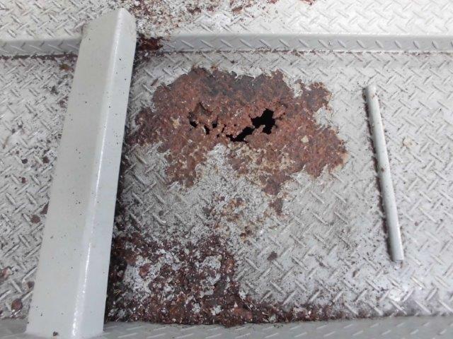 上記写真のように、錆の進行によって鉄が腐食し、パレットに穴(孔とも言います)が開いてしまうケースがよくあります。 このような場合は、大至急で補修をしないと穴が広がり、利用者の方が踏み抜いてケガをしてしまったり、タイヤが落ちてしまう可能性があります。 また、穴が開いていると錆汁が機械式駐車場の階下の車に滴り落ちている可能性もあります。恒常的に滴り落ちた錆汁は、洗車では落ちなくなってしまうので、トラブルの元にもなってしまいます。