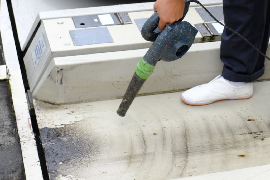 基本的には掃き掃除をするケースが多いですが、汚れの状態によっては高圧洗浄機を使うこともあります。 この後のケレン作業や塗装作業が円滑にできるよう、しっかりと行います。